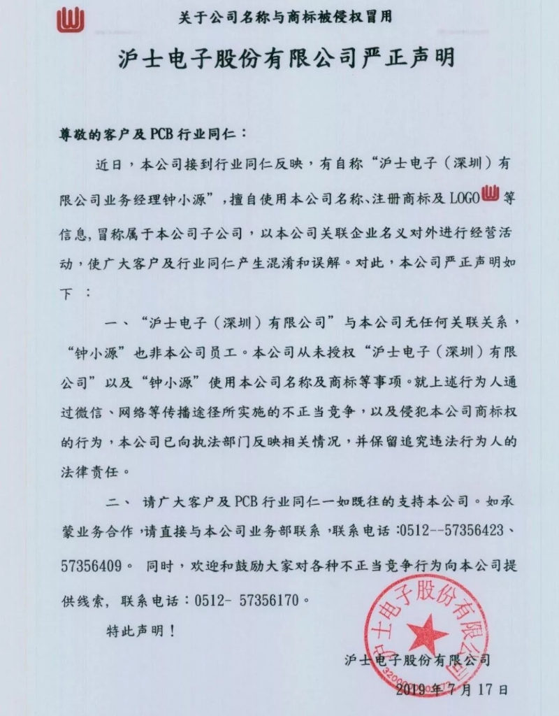July 17, 2019, a solemn statement on the infringement and fraudulent use of company names and trademarks